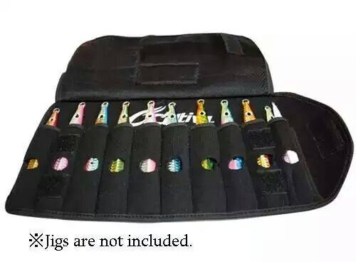 È fatta in neoprene ed ha la chiusura in velcro e nelle taglie piccole può alloggiare due casting jig per ogni scomparto.